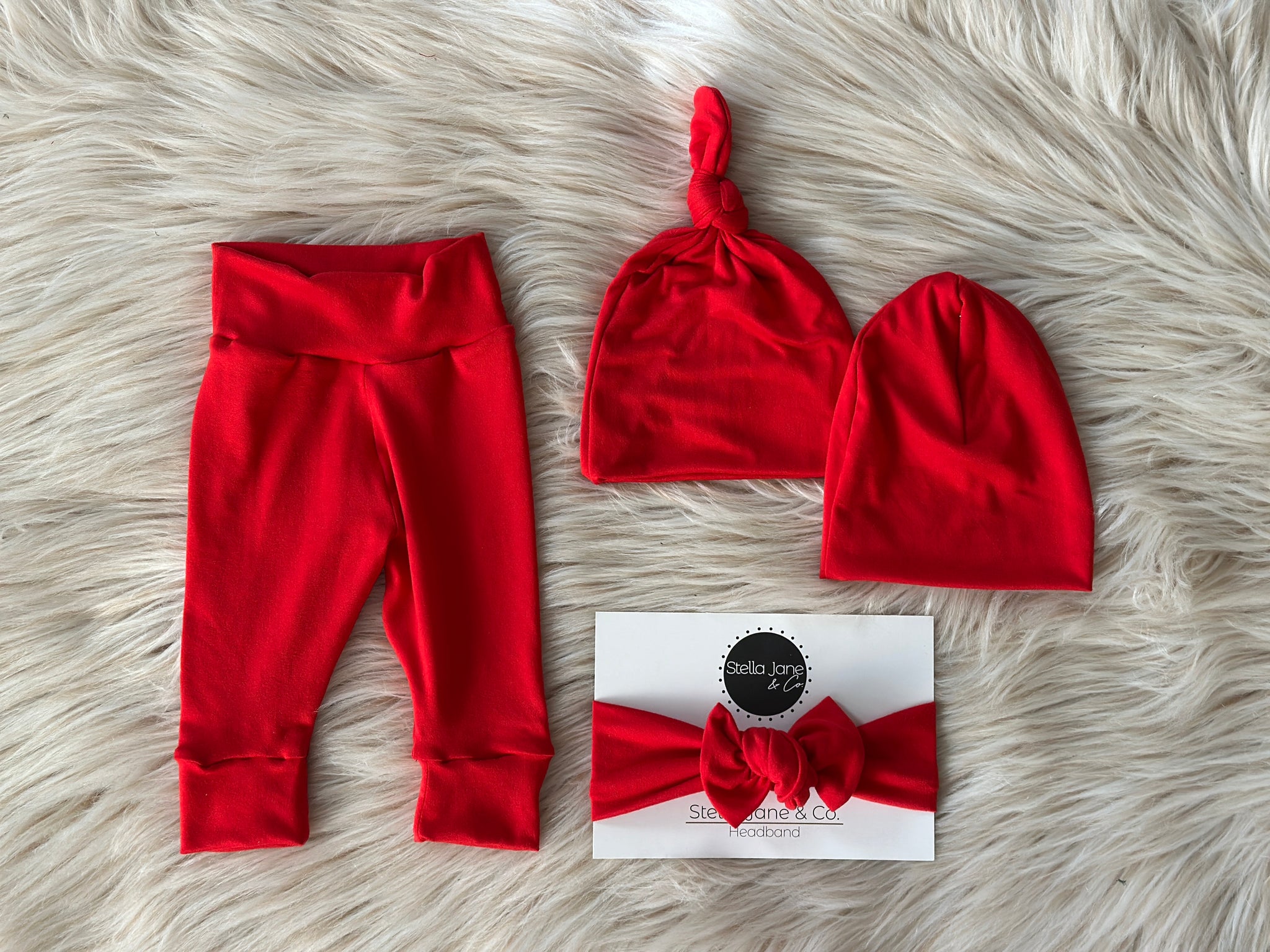 Set includes a super soft and stretchy pant and the option to add a Top knot hat (top knots only available in newborn and 0-3 months sets)or Slouchy and/or  Headband to complete the outfit.